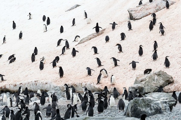 Around about 0700 the ship arrived in the vicinity of Brown Bluff and slowly approached the shore to a drift position. With a scout Zodiac ashore the decision was made to go ahead with the landing. Brown Bluff is a massive structure, essentially a cross-section through a sub-glacial volcano, which erupted about 1 million years ago. However, most visitors come to see the Adélie and Gentoo penguins nesting on the gravel and boulder raised beach and there was no shortage of them. Additionally some guests followed Tony to view a snow petrel nest until it was noted that a kelp gull nest was adjacent and everyone moved away.