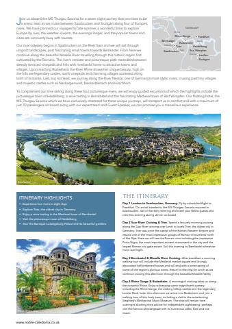 www.noble-caledonia.co.ukJoin us aboard the MS Thurgau Saxonia for a seven night journey that promises to be a scenic treat as we cruise between Saarbrucken and Stuttgart along four of Europe%u2019s rivers. We have planned our voyages for late summer, a wonderful time to explore Europe by river, the weather is warm, the evenings longer, and the popular towns and cities are not overly busy with tourists.Our river odyssey begins in Saarbrucken on the River Saar and we will sail through unspoilt landscapes, past fascinating small towns towards Bernkastel. From here we continue along the beautiful Moselle River travelling through this historic region first cultivated by the Romans. The river%u2019s intricate and picturesque path meanders between steeply terraced vineyards and hills with riverbanks home to attractive towns and villages. Upon reaching Rudesheim the River Rhine shows her unique beauty; high on the hills are legendary castles, sunlit vineyards and charming villages scattered along both of its banks. Last, but not least, we journey along the River Neckar, one of Germany%u2019s most idyllic rivers, cruising past tiny villages and majestic castles such as Neckargemund, Neckarsteinach and Hirschhorn. To complement our time sailing along these four picturesque rivers, we will enjoy guided excursions of which the highlights include the picturesque town of Heidelberg, a wine tasting in Bernkastel and the fascinating Medieval town of Bad Wimpfen. Our floating hotel, the MS Thurgau Saxonia which we have exclusively chartered for these unique journeys, will transport us in comfort and with a maximum of just 70 passengers on board along with our expert team and Guest Speaker, we can promise you a marvellous experience.THE ITINERARYDay 1 London to Saarbrucken, Germany. Fly by scheduled flight to Frankfurt. On arrival transfer to the MS Thurgau Saxonia moored in Saarbrucken. Sail in the early evening and meet your fellow guests and crew this evening during dinner on board.Day 2 Saar River Cruising & Trier. Spend a leisurely morning cruising along the Saar River arriving over lunch in lovely Trier, the oldest city in Germany. Trier was once the capital of the Roman Western Empire and retains one of the most impressive groups of Roman monuments north of the Alps. Here we will see the Roman ruins including the impressive Porta Nigra, the most important ancient monument in the city and the largest Roman city gate extant. Sail this evening to Bernkastel where we moor overnight. Day 3 Bernkastel & Moselle River Cruising. After breakfast a morning walking tour will include the Medieval market square and lovingly decorated half-timbered houses and will end with a wine tasting of some of the region%u2019s glorious wines. Return to the ship for lunch as we continue cruising this afternoon through the beautiful Moselle Valley. Day 4 Rhine Gorge & Rudesheim. A morning of cruising takes us along the romantic Rhine. Enjoy witnessing some magnificent scenery including the Rhine Gorge, the striking hilltop castles and the legendary Lorelei Rock. Later this afternoon we arrive into Rudesheim and join a walking tour of this lively town, including a visit to the entertaining Siegfried%u2019s Mechanical Music Museum. The ship will remain here overnight allowing time ashore for independent sightseeing; perhaps visit the famous Drosselgasse with its numerous cafes, bars and live music.ITINERARY HIGHLIGHTS %u2022 Experience four rivers in eight days %u2022 Explore Trier, the oldest city in Germany%u2022 Enjoy a wine tasting in the Medieval town of Bernkastel%u2022 Visit the picturesque town of Heidelberg%u2022 Tour the Baroque Ludwigsburg Palace and its beautiful gardensHeidelbergPorta Nigra, TrierGERMANYBLACKSEACernavodaTulceaConstantaHeidelbergMainDanubeDANUBEDELTADanubeRhineMoselleRhine Gorge FrankfurtRudesheimTrierBernkastelSaarbruckenStuttgartBad WimpfenLauffen NeckarSaarBernkastel