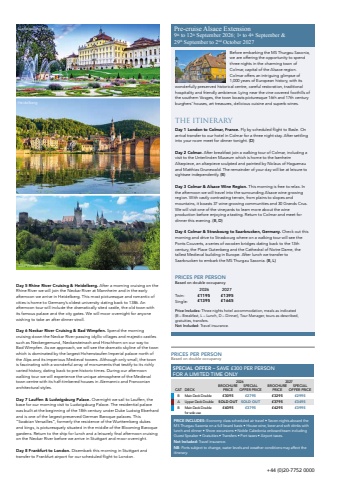+44 (0)20-7752 0000Ludwigsburg PalaceDay 5 Rhine River Cruising & Heidelberg. After a morning cruising on the Rhine River we will join the Neckar River at Mannheim and in the early afternoon we arrive in Heidelberg. This most picturesque and romantic of cities is home to Germany%u2019s oldest university dating back to 1386. An afternoon tour will include the dramatically sited castle, the old town with its famous palace and the city gates. We will moor overnight for anyone wishing to take an after dinner stroll. Day 6 Neckar River Cruising & Bad Wimpfen. Spend the morning cruising down the Neckar River passing idyllic villages and majestic castles such as Neckergemund, Neckarsteinach and Hirschhorn on our way to Bad Wimpfen. As we approach, we will see the dramatic skyline of the town which is dominated by the largest Hohenstaufen Imperial palace north of the Alps and its imperious Medieval towers. Although only small, the town is fascinating with a wonderful array of monuments that testify to its richly varied history, dating back to pre-historic times. During our afternoon walking tour we will experience the unique atmosphere of the Medieval town centre with its half-timbered houses in Alemannic and Franconian architectural styles.Day 7 Lauffen & Ludwigsburg Palace. Overnight we sail to Lauffen, the base for our morning visit to Ludwigsburg Palace. The residential palace was built at the beginning of the 18th century under Duke Ludwig Eberhard and is one of the largest preserved German Baroque palaces. This %u201cSwabian Versailles%u201d, formerly the residence of the Wurttemberg dukes and kings, is picturesquely situated in the middle of the Blooming Baroque gardens. Return to the ship for lunch and a leisurely final afternoon cruising on the Neckar River before we arrive in Stuttgart and moor overnight.Day 8 Frankfurt to London. Disembark this morning in Stuttgart and transfer to Frankfurt airport for our scheduled flight to London.PRICE INCLUDES: Economy class scheduled air travel %u2022 Seven nights aboard the MS Thurgau Saxonia on a full board basis %u2022 House wine, beer and soft drinks with lunch and dinner %u2022 Shore excursions %u2022 Noble Caledonia onboard team including Guest Speaker %u2022 Gratuities %u2022 Transfers %u2022 Port taxes %u2022 Airport taxes. Not Included: Travel insurance. NB: Ports subject to change, water levels and weather conditions may affect the itinerary.CAT DECK B Main Deck DoubleA Upper Deck DoubleB Main Deck Double for sole usePRICES PER PERSONBased on double occupancySPECIAL OFFER %u2013 SAVE %u00a3300 PER PERSON FOR A LIMITED TIME ONLYHeidelbergPalaiokastrista Bornholm islandBefore embarking the MS Thurgau Saxonia, we are offering the opportunity to spend three nights in the charming town of Colmar, capital of the Alsace region. Colmar offers an intriguing glimpse of 1,000 years of European history, with its wonderfully preserved historical centre, careful restoration, traditional hospitality and friendly ambience. Lying near the vine covered foothills of the southern Vosges, the town boasts picturesque 16th and 17th century burghers%u2019 houses, art treasures, delicious cuisine and superb wines.Pre-cruise Alsace Extension9th to 12th September 2026; 1st to 4th September & 29th September to 2nd October 2027 Day 1 London to Colmar, France. Fly by scheduled flight to Basle. On arrival transfer to our hotel in Colmar for a three night stay. After settling into your room meet for dinner tonight. (D)Day 2 Colmar. After breakfast join a walking tour of Colmar, including a visit to the Unterlinden Museum which is home to the Isenheim Altarpiece, an altarpiece sculpted and painted by Niclaus of Haguenau and Matthias Grunewald. The remainder of your day will be at leisure to sightsee independently. (B)Day 3 Colmar & Alsace Wine Region. This morning is free to relax. In the afternoon we will travel into the surrounding Alsace wine growing region. With vastly contrasting terrain, from plains to slopes and mountains, it boasts 37 wine-growing communities and 30 Grands Crus. We will visit one of the vineyards to learn more about the wine production before enjoying a tasting. Return to Colmar and meet for dinner this evening. (B, D)Day 4 Colmar & Strasbourg to Saarbrucken, Germany. Check out this morning and drive to Strasbourg where on a walking tour will see the Ponts Couverts, a series of wooden bridges dating back to the 13th century, the Place Gutenberg and the Cathedral of Notre Dame, the tallest Medieval building in Europe. After lunch we transfer to Saarbrucken to embark the MS Thurgau Saxonia. (B, L)THE ITINERARYBad WimpfenPRICES PER PERSONBased on double occupancy2026 2027Twin: Single: Price Includes: Three nights hotel accommodation, meals as indicated (B %u2013 Breakfast, L %u2013 Lunch, D %u2013 Dinner), Tour Manager, tours as described, gratuities, transfers. Not Included: Travel insurance.%u00a31195%u00a31395%u00a31395%u00a31645BROCHUREPRICE2026SPECIALOFFER PRICE%u00a33095SOLD OUT%u00a34095%u00a32795SOLD OUT%u00a33795BROCHUREPRICE2027SPECIALOFFER PRICE%u00a33295%u00a33795%u00a34295%u00a32995%u00a33495%u00a33995