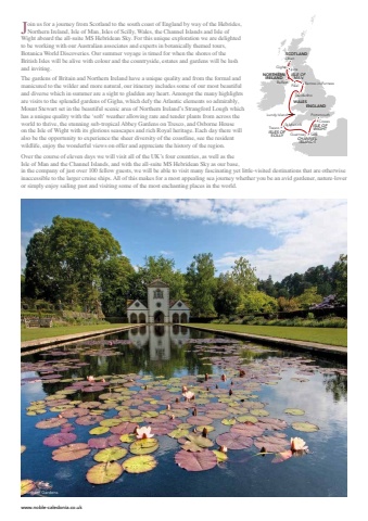 www.noble-caledonia.co.uk J oin us for a journey from Scotland to the south coast of England by way of the Hebrides, Northern Ireland, Isle of Man, Isles of Scilly, Wales, the Channel Islands and Isle of Wight aboard the all-suite MS Hebridean Sky. For this unique exploration we are delighted to be working with our Australian associates and experts in botanically themed tours, Botanica World Discoveries. Our summer voyage is timed for when the shores of the British Isles will be alive with colour and the countryside, estates and gardens will be lush and inviting. The gardens of Britain and Northern Ireland have a unique quality and from the formal and manicured to the wilder and more natural, our itinerary includes some of our most beautiful and diverse which in summer are a sight to gladden any heart. Amongst the many highlights are visits to the splendid gardens of Gigha, which defy the Atlantic elements so admirably, Mount Stewart set in the beautiful scenic area of Northern Ireland%u2019s Strangford Lough which has a unique quality with the %u2018soft%u2019 weather allowing rare and tender plants from across the world to thrive, the stunning sub-tropical Abbey Gardens on Tresco, and Osborne House on the Isle of Wight with its glorious seascapes and rich Royal heritage. Each day there will also be the opportunity to experience the sheer diversity of the coastline, see the resident wildlife, enjoy the wonderful views on offer and appreciate the history of the region. Over the course of eleven days we will visit all of the UK%u2019s four countries, as well as the Isle of Man and the Channel Islands, and with the all-suite MS Hebridean Sky as our base, in the company of just over 100 fellow guests, we will be able to visit many fascinating yet little-visited destinations that are otherwise inaccessible to the larger cruise ships. All of this makes for a most appealing sea journey whether you be an avid gardener, nature-lover or simply enjoy sailing past and visiting some of the most enchanting places in the world.Bodnant GardensTrescoENGLANDPortsmouthSCOTLANDSt Martin%u2019sLundy IslandBelfastWALESISLES OFSCILLY CHANNELISLANDSGuernseyNORTHERNIRELANDPeelObanGigha JuraISLE OFMANBarrow-in-FurnessLlandudnoSarkISLE OFWIGHTCowes