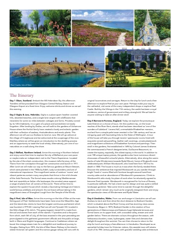 www.noble-caledonia.co.uk The Itineraryoriginal locomotives and carriages. Return to the ship for lunch and a free afternoon to explore Peel at your own pace. Perhaps make your way to the cathedral, visit some of the many independent shops or explore Peel Castle. Built by the Vikings in the 11th century, the castle has been a royal residence, centre of government and military stronghold. We sail late for anyone wishing to take an after dinner stroll.Day 5 Barrow-in-Furness, England. Today we explore the picturesque Lake District on a choice of tours. On the southern tip, on the lower reaches of the River Kent, stands what has been described as %u2018one of the wonders of Lakeland%u2019. Levens Hall, a remarkable Elizabethan mansion, evolved from a simple pele tower erected in the 13th century and has an intriguing past with fascinating links to the Duke of Wellington. A tour of the house will take you through Levens%u2019 spectacular rooms lined with exquisite carved oak panelling, leather wall coverings, ornate plasterwork and magnificent collections of Elizabethan furniture and paintings. Then stroll in the gardens, first established in 1694 by Colonel James Grahame. He commissioned a French designer/artist, Guillaume Beaumont, to create the topiary, reputedly, the oldest topiary in the world. In addition to over 100 unique topiary pieces, the gardens also have numerous vibrant showcases of beautiful colourful plants. Alternatively, drive along the scenic banks of Lake Windermere towards Rydal Mount, home of England%u2019s most celebrated poet, William Wordsworth, who lived here from 1813 to his death in 1850. The house is much as it was when the family resided there. Discover the ambience that inspired Wordsworth as you wander through bright %u2018lived-in%u2019 rooms filled with furniture bought second hand from country sales and an abundance of Wordsworth%u2019s possessions. Climb to Wordsworth%u2019s attic study, his place of work when he reluctantly agreed to become Poet Laureate. Wordsworth is recognised for his love of flowers, in particular daffodils. He had a keen eye for design and was quite a skilled landscape gardener. Take some time to wander through the delightful gardens, which remain very much as he originally designed them and enjoy the spectacular views of Windermere and Rydal Water.Day 6 Llandudno, Wales. From our anchorage in Llandudno we will use Zodiacs to land and then drive the short distance to Bodnant Garden, which is situated above the River Conwy and has stunning views across Snowdonia. Begun in 1875, Bodnant Garden is the creation of four generations of Aberconways and features huge Italianate terraces and formal lawns on its upper level, with a wooded valley, stream and wild garden below. There are dramatic colours throughout the season, with herbaceous borders, roses, hydrangeas, water lilies and clematis that delight throughout the summer. You can then choose to return to the ship for lunch and enjoy a free afternoon in Llandudno. Developed as an upmarket holiday town for Victorian visitors, this seaside town still retains much of its 19th century grandeur, with graceful wedding-cake architecture Day 1 Oban, Scotland. Embark the MS Hebridean Sky this afternoon. Transfers will be provided from Glasgow Central Railway Station and Glasgow Airport at a fixed time. Enjoy welcome drinks and dinner as we sail this evening.Day 2 Gigha & Jura, Hebrides. Gigha is a place apart: heather covered hills, deserted beaches, and a single lane verged with wildflowers that meanders for some six miles between cottages and farms. Privately owned by its 120 inhabitants, it is a gem of a place and somewhere not easily forgotten. After landing by Zodiac, we will walk to the gardens of Achamore House where the Horlick family have created a lovely and eclectic garden with their collection of azaleas, rhododendrons and exotic plants. This afternoon we will use our Zodiacs to land on Jura. We will go ashore at the village of Craighouse and be welcomed at the cooperage of the Jura Distillery where we will be given an introduction to the distilling process and an opportunity to taste the local whisky. Alternatively, join one of our naturalists on a walk along the shore.Day 3 Belfast, Northern Ireland. Arrive this morning in Northern Ireland and enjoy some free time to explore the city of Belfast at your own pace or maybe make an independent visit to the Titanic Experience. Located by the site of the ship%u2019s construction, this museum tells the story of the Titanic from her conception through her construction and launch in 1911. After lunch we will make our way to the famous gardens at Mount Stewart, which were planted in the 1920s by Edith, Lady Londonderry and are of international importance. The magnificent series of outdoor %u2018rooms%u2019 and vibrant parterres contain many rare plants that thrive in the mild climate of the Ards Peninsula. The formal areas exude a strong Mediterranean feel and resemble an Italian villa landscape; the wooded areas support a range of plants from all corners of the world. There will be time to explore the opulent house which reveals a fascinating heritage and historic world famous artefacts and artwork. Do not leave without taking in the magnificent views of Strangford Lough from the Temple of the Winds. Day 4 Peel, Isle of Man. Arrive this morning on the Isle of Man at the main fishing port of Peel. Settlements have been here since the Mesolithic Age and the island also claims to have the longest continuous parliament which was founded in 979 AD. Leaving Peel we will visit Tynwald Hill, located in the little village of St John%u2019s. This grass-topped, tiered hill is made from the soil and stones from each of the island%u2019s 17 parishes and is the point from which, each 5th of July, all the laws enacted in the year preceding are promulgated to the gathered government officials and the public at large, both in Manx and English languages. Cont