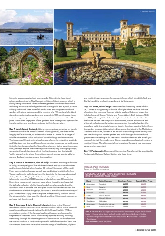 +44 (0)20 7752 0000PRICE INCLUDES: 10 nights aboard the MS Hebridean Sky on a full board basis %u2022 House wine, beer and soft drinks with lunch & dinner %u2022 Noble Caledonia expedition team %u2022 Shore excursions %u2022 Gratuities %u2022 Transfers %u2022 Port taxes. Not Included: Travel insurance.Brochure PriceAmundsenByrdMawsonMawsonScottShackletonShackletonAmundsenByrdStandardSuperiorPremiumCornerDeluxe BalconyOwner%u2019s BalconyHebridean Standard for sole useSuperior for sole useDeck Suite Category Special Offer Price%u00a36995%u00a37295%u00a37595%u00a38095%u00a38895%u00a39295%u00a39795%u00a38995%u00a39295%u00a36495%u00a36795%u00a37095%u00a37595%u00a38395%u00a38795%u00a39295%u00a38495%u00a38795PRICES PER PERSONBased on double occupancySPECIAL OFFER %u2013 SAVE %u00a3500 PER PERSON FOR A LIMITED TIME ONLYAbbey Gardens, Trescoxxxxxxxxlining its sweeping waterfront promenade. Alternatively, have lunch ashore and continue to Plas Cadnant, a hidden historic garden, which is slowly being uncovered. Three different gardens have been discovered, including an unusual walled garden with curving walls and a pool, a secret valley garden with three waterfalls and a river, and an upper woodland garden with stone outcrops and the remains of a 19th century folly. Work started on restoring the gardens and grounds in 1997, which was a huge undertaking as large areas had not been maintained for more than 70 years. Since then large parts of the gardens have undergone a spectacular transformation and have been restored to their former glory.Day 7 Lundy Island, England. After a morning at sea we arrive on Lundy, a remote island in the Bristol Channel. Although small, just three miles long by half a mile wide, its isolation has made it a home for a range of wildlife whilst there is also a clutch of listed buildings and monuments. The towering cliffs and rocky shoreline are a haven for migrating seabirds and Sika deer, red deer and Soay sheep can also be seen as we walk along its traffic-free lanes and paths. Spend the afternoon being as active as you wish, perhaps explore the wide bays and coves by way of hanging valleys, see ancient burial chambers, climb the lighthouse or buy the island%u2019s %u2018puffin stamps%u2019 at the shop. If conditions permit we may also be able to use our Zodiacs to cruise around the coastline.Day 8 Tresco & St Martin%u2019s, Isles of Scilly. Arrive this morning in the Isles of Scilly, an archipelago of five inhabited islands and up to one hundred and forty uninhabited islets, located 30 miles off the coast of Cornwall. From our central anchorage, we will use our Zodiacs to visit traffic-free Tresco, walking its idyllic lanes from the beach to the famous subtropical Abbey Gardens. Defying the Atlantic weather, this miracle of a garden is home to more than 20,000 species of plants from over 80 countries. Enjoy time to wander at your own pace along the paths, perhaps visit the Valhalla collection of ship figureheads from ships wrecked on the islands or relax in the caf%u00e9. We also plan to use local tenders to visit the northernmost island of the group, St Martin%u2019s, a small island community of just 120 residents. Enjoy time to explore independently, climb to one of the viewpoints for vistas over the islands and the offshore seal colonies or perhaps visit the vineyard.Day 9 Guernsey & Sark, Channel Islands. Arriving in the Channel Islands we explore Guernsey on a panoramic drive, taking in the beautiful coastline and beaches and visiting the Little Chapel, built in 1914 as a miniature version of the famous basilica at Lourdes and covered in fragments of shattered china. Alternatively spend a leisurely morning wandering through the charming town of St Peter Port. In the afternoon we use our Zodiacs to land on the peaceful traffic-free island of Sark. We can wander the narrow lanes alive with the songs of chaffinches, skylarks and mistle thrush as we see the narrow isthmus which joins Little Sark and Big Sark and the enchanting gardens at La Seigneurie.Day 10 Cowes, Isle of Wight. Renowned as the sailing capital of the UK, Cowes is our gateway to the Isle of Wight where we have a choice of options this morning. You may wish to explore Osborne House, the holiday home of Queen Victoria and Prince Albert. Built between 1845 and 1851, it brought the Italianate style of architecture to the island. In the house we can see sumptuous state rooms, ornate architecture and a fine art collection whilst outside we can enjoy the walled garden, the woodland walk, the private beach or take in the views over the Solent from the garden terraces. Alternatively, drive across the island to the Mottistone Gardens and Estate, located in an area of outstanding natural beauty. We can see the organic kitchen garden and walk through the orchard and garden terraces taking in the sea views. For those keen to take a walk you may wish to visit the nearby Long Stone, a sandstone pillar which retains a mystical history. The afternoon is free to explore Cowes at your own pace as we anchor overnight.Day 11 Portsmouth. Disembark this morning. Transfers will be provided to Portsmouth Harbour Railway Station at a fixed time.Exploring by Zodiac Osborne House