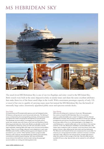 www.noble-caledonia.co.uk Your SuiteOn board there are 59 exceptionally spacious and well-designed suites. All feature a sitting area and some have private balconies. The feeling of luxury is enhanced by the wood panelling and brass, which predominates throughout the vessel conveying the atmosphere of a private yacht. The passenger accommodation is arranged over five decks and all suites have outside views with those on the Scott and Shackleton Decks featuring private balconies. Each suite affords considerable comfort with en-suite bathroom featuring vanity unit with sink and walk-in shower, large wardrobes, dressing table with large mirror and stool and excellent storage. There is a mini-fridge, television and a telephone in each suite. Refillable water bottles, towelling dressing gowns and slippers are also provided for your comfort. Other facilities include a programmable electronic safe, hairdryer, assorted Noble Isle toiletries and individually controlled air-conditioning and heating. Soft hues and blended tones enhance the traditional maritime style making the passenger accommodation an inviting and relaxing place to be.The much loved MS Hebridean Sky is one of our two flagships and sister vessel to the MS Island Sky.Both vessels were built in the same shipyard in Italy at similar times and share the same excellent attributes that make them two of the finest small ships in the world. With a maximum passenger capacity of only 118, a vessel of her size is capable of carrying many more but instead the MS Hebridean Sky has the benefit of unusually large suites, luxuriously appointed public areas and spacious outside decks. ms hebridean skyAlfresco Dining Owner%u2019s Balcony Suite The RestaurantYour DiningWith only one sitting and a maximum of just over 100 passengers, the cuisine on board the MS Hebridean Sky is of a consistent superior quality that befits such a vessel. In keeping with the informal atmosphere on board, when dining you are able to choose your seating arrangements and choice of restaurants at your leisure; whether that be joining a table of four to six other passengers in the elegant %u00e0 la carte Restaurant or, outside buffet-style on the Lido Deck in the evening sunshine. In the main Restaurant, breakfast is served buffet-style, with certain items cooked to order on request. Lunch and dinner menus offer plenty of choice, often reflecting the daily catch and local delicacies. The Welcome and Farewell dinners are a sumptuous five course affair. To enhance your dining experience further a selection of wines is included with both meals. Afternoon tea and pre-dinner canap%u00e9s take place in either the comfort of the Lounge or the Club. Tea and coffee are also available 24 hours a day. Special diets can be catered for with sufficient notice.