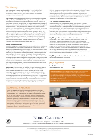 Our current booking conditions apply to all reservations and are available on request.Cover image: Prague Castle and St. Nicolas Church.80FUL25_EOld-New Synagogue, Europe%u2019s oldest working synagogue and one of Prague%u2019s earliest Gothic buildings. After our tour, you can return to the hotel for an afternoon at leisure or if you would prefer to continue to explore the city independently, our local guide will recommend some spots for lunch and places to visit. This evening, after a canap%u00e9 reception we will transfer to the Estates Theatre for our performance of Don Giovanni. (B, C*)%u2018Don Giovanni%u2019 by Amadeus Mozart First performed in 1787 at the Estates Theatre, %u2018Don Giovanni%u2019 is Mozart%u2019s exhilarating retelling of the Don Juan legend, filled with some of his most famous and much-loved music. Combining comedy and tragedy, the opera follows the notorious womaniser as he lusts his way towards his dramatic downfall. In this production the director and conductor ask the questions is Giovanni an incorrigible slave to his instincts, or is he a provocateur, rebel, revolutionary even, human and symbol, or is he a mere catalyst around whom Mozart thoroughly depicts the constantly changing universe of female emotions? Day 4 Prague. After breakfast we will leave the city for a short drive to Nelahozeves Castle, one of Bohemia%u2019s finest Renaissance castles. This 16th century estate is perched above the Vltava River and is another spectacular family home of the Lobkowicz family. After a tour of the castle interior we will enjoy lunch at the castle. This afternoon on our return to Prague we will visit the home of Czech composer Antonin Dvorak. The Baroque house now functions as an international music centre and museum. We will learn about the composer%u2019s humble beginnings to worldwide success. After some time to relax and freshen up at the hotel we will meet for our farewell dinner at a local restaurant. (B, L, D)Day 5 Prague to London. After breakfast transfer to the airport for our return scheduled flight to London. (B)ALMANAC X ALCRON Close to Prague%u2019s Old Town and Wenceslas Square, the Almanac X Alcron Hotel is a chic hotel with a wonderful history, starting life as the Alcron Hotel in 1932. Enter through the listed 1930s fa%u00e7ade and marvel at the Art Deco inspired marble lobby with its crystal chandeliers and artwork by local artists. The 204 rooms are contemporary, timeless and designed to provide a calm environment in which to relax. Elegant bathrooms feature heated floors and are covered in stone tiles. The rooms come with all the usual amenities including desk, small seating area, tea and coffee making facilities and Wi-Fi. The hotel features an award-winning restaurant along with a bar/lounge, rooftop bar and coffee shop. There is also a gym and sauna.2 Chester Close, Belgravia, London, SW1X 7BE+44 (0)20 7752 0000 | info@noble-caledonia.co.uk | www.noble-caledonia.co.ukPRICE INCLUDES: Economy class scheduled air travel %u2022 Four nights hotel accommodation at the Almanac X Alcron Hotel %u2022 Meals as indicated (B - Breakfast, L - Lunch, D - Dinner, C*- Canap%u00e9s) %u2022 Wine or beer with included lunches & dinners %u2022 Excursions as described %u2022 Two Opera Performances %u2022 Noble Caledonia Tour Manager %u2022 Gratuities %u2022 Transfers %u2022 Airport taxes. Not Included: Travel insurance.Group Size: We are restricting the group size to just 25 participants.PRICES PER PERSONBased on double occupancyTwin/Double:Twin/Double for Sole Use%u00a33195%u00a33895The ItineraryDay 1 London to Prague, Czech Republic. Fly by scheduled flight. Arrive this afternoon and transfer to the Almanac X Alcron Hotel for our four night stay. Settle into your room before meeting for dinner this evening at a local restaurant. (D)Day 2 Prague. After breakfast we will begin our morning city tour of Prague at Prague Castle, a UNESCO World Heritage Site. According to the Guinness World Records it is the world%u2019s largest ancient castle complex, covering an area greater than seven football fields. The castle has always been the seat of Czech monarchs and is the official residence of the head of state. Dating back to the 9th century, it grew haphazardly as different rulers added their own touches. From here we will visit the Lobkowicz Palace, a beautiful 16th century Baroque Palace, to admire one of Europe%u2019s oldest and finest private art collections. After lunch we continue to the Strahov Monastery Library, the largest monastic library in the country, whose magnificent Baroque halls date from the 17th and 18th centuries. Our visit will include access to two library halls normally closed to the public: the Theological Hall and Philosophical Hall. Return to the hotel for some time to relax before meeting in the early evening for a canap%u00e9 reception. We then make our way to the National Theatre to watch the performance of Libu%u0161e. (B, L, C*)%u2018Libu%u0161e%u2019 by Bedrich Smetana According to legend, Princess Libu%u0161e, having inherited the throne of Bohemia following the death of her father, founded the city of Prague. The first act features a land dispute between two brothers, the loser contesting any verdict brought about by a woman. This prompts Libu%u0161e to announce her intention to marry, and the hunt begins to find a suitable partner. The choice falls on the surprising figure of Premysl, a farmer. The sub-plot of the warring brothers continues with their own courtship by Krasava. She loves the one who had lost out in the land dispute and pretended to love the other in order to provoke a proposal out of the chosen one. This not only has the desired effect but also prompts him to accept Libu%u0161e%u2019s earlier verdict with good grace. The opera then ends with a grand tableau in which Libu%u0161e has a prophetic vision of the glorious future of the Czech nation.Day 3 Prague. This morning we will walk from the hotel to the Jewish Quarter