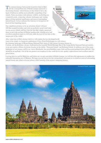 www.noble-caledonia.co.uk This unusual journey between the beautiful island of Bali and the cosmopolitan city of Kuala Lumpur represents a fascinating itinerary which focuses on the island of Java, the heart of Indonesia and the most culturally compelling of her islands. From encounters with endemic wildlife, snorkelling on wonderful corals, witnessing volcanic landscapes and visiting places of deep spiritual significance and areas of outstanding natural beauty, we have planned the itinerary to incorporate all facets of this beguiling region. Our expedition promises to be an adventure shared with just 100 like-minded travellers and with our perfectly suited small ship, we can access islands and bays that the big ships simply cannot get close to and with our fleet of Zodiac landing craft, friendly crew and excellent expedition team we will truly make the most of our time in this unique part of the world. After some time in Bali, during which we will explore the less developed north coast of the island, we begin our exploration of Java. From Probolinggo we will witness the stunning landscape of Mount Bromo National Park, learn of 16th century Javanese history in Cirebon, see the Krakatoa volcano, birdwatch in the beautiful World Heritage Site of the Ujung Kulon National Park and snorkel, swim and explore ribbons of pristine beaches in the idyllic %u2018Thousand Islands%u2019 and Belitung Islands. In addition, one of the many highlights of our journey will be our visit to Borobudur, the great Buddhist stupa, built and decorated perhaps before 800 AD. This should be on anybody%u2019s list of the ten greatest art-complexes in the world for its size, quality, sophistication and excellent state of preservation. Leaving Java we sail for Malaysia, and before our voyage concludes in Kuala Lumpur, we will have the opportunity to explore the culturally fascinating city of Malacca. We hope you can join us for this extraordinary adventure as we discover areas of outstanding natural beauty and witness diverse cultures while learning of the region%u2019s intriguing history. MALAYSIAKuala LumpurSemarangINDONESIAJAVAGULF OF THAILANDMalaccaBelitungIslandsBaweanIslandMount Bromo BALICelukan BawangBenoaProbolinggoBorobudurYogyakartaCirebonUjung KolonNational ParkPulau KrakatoaThousand IslandsJAVASEAExploring by ZodiacPrambanan Temple, Yogyakarta
