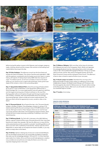 +44 (0)20 7752 0000PRICE INCLUDES: Economy class scheduled air travel %u2022 Overnight hotel accommodation in Bali with breakfast %u2022 13 nights aboard the MS Island Sky on a full board basis (inclusive of overnight stay for Borobudur visit) %u2022 House wine, beer and soft drinks with lunch and dinner %u2022 Noble Caledonia expedition team %u2022 Shore excursions %u2022 Gratuities %u2022 Transfers %u2022 Airport taxes %u2022 Port taxes. Not Included: Travel insurance, Indonesian visa.Deck Suite CategoryMagellan Standard Columbus SuperiorMarco Polo Premium Marco Polo Corner Erikson Deluxe BalconyExplorer Owner%u2019s Balcony SuitesExplorer Island SuiteMagellan Standard for sole useColumbus Superior for sole useBrochure Price Special Offer Price%u00a310995%u00a311395%u00a311795%u00a312295%u00a312995%u00a313495%u00a313995%u00a310995%u00a311395%u00a310495%u00a310895%u00a311295%u00a311795%u00a312495%u00a312995%u00a313495%u00a310495%u00a310895PRICES PER PERSONBased on double occupancySPECIAL OFFER %u2013 SAVE %u00a3500 PER PERSON PLUS NO SINGLE SUPPLEMENT FOR A LIMITED TIME ONLYKasepuhan Palacebefore touring the palace museum which features royal carriages, weaponry, masks, clothing, artwork and the mosque. We continue to the bustling local market before returning to the ship.Day 10 Pulau Krakatoa. This afternoon we sail into the Suna Strait and towards the island of Krakatoa. The volcano here famously exploded in 1883 with the explosion considered to be the loudest sound ever heard in modern history, with reports of it being heard nearly 3,000 miles from its point of origin. If conditions permit, we will use our Zodiacs to land on the island where you can choose to join a nature walk at the base, climb up the lower slopes of the volcano or swim in the surrounding waters.Day 11 Ujung Kolon National Park. Arrive this morning at the far western tip of Java for a day of exploration in the Ujung Kulon National Park, a World Heritage Site. It is a stunningly beautiful area with great bird watching and the largest remaining area of lowland rainforest on the Java Plain. During guided walks we will explore the park and thriving ecosystem alive with monkeys, macaques, deer and varied birdlife which live amongst the towering fig trees, vibrant orchids and ancient medicinal plants. This afternoon there will be the opportunity to swim, snorkel or relax on the beach.Day 12 Thousand Islands. We will spend the day in the %u2018Thousand Islands%u2019, located in the Bay of Jakarta. The archipelago consists of a string of 110 islands stretching 28 miles and covering an area of 107,489 hectares of land and sea. We hope to land on Pulau Harapan where we can visit the local community and learn about their work developing mangrove forests. There will also be time to enjoy swimming, snorkelling or relaxing on one of the island%u2019s beaches.Day 13 Belitung Islands. Our final call in Indonesia is the idyllic Belitung Islands, a group of islands off the coast of Sumatra famed for their long clean beaches and crystal clear seawater. We have the afternoon to enjoy the fine white sandy beaches and the wonderful coral reefs. Snorkelling platforms will allow us to swim with a multitude of colourful fish, molluscs and sea urchins. Meanwhile on nature walks we will explore the forest for birdlife, or you may prefer to simply relax on the beach.Day 14 At Sea. Spend a relaxing day at sea as we cruise towards Malaysia and into the Malacca Strait which was named after the Malacca Sultanate that ruled over the archipelago between 1414 and 1511. It is from here that early traders from Arabia, Africa and Persia would trade glassware, camphor, ivory, sandalwood and perfumes and today the Strait is one of the most important shipping lanes in the world. Mount Bromo VolcanoBawean deer Fortress, MalaccaDay 15 Malacca, Malaysia. With more than its fair share of colonisers from Malaysian princes to the Portuguese, Dutch, British and Japanese, this strategically placed city has a fascinating history which is brought vividly to life in the excellent Ethnographical Museum. During our guided walk we will also visit the 16th century Portuguese fortress, the former Dutch Governor%u2019s house and the impressive Christ Church. This afternoon is free to relax on board or explore further at your own pace. Day 16 Kuala Lumpur to London. Disembark this morning in Port Klang and transfer to Kuala Lumpur where our walking tour will include Independence Square, the Masjid Jamek Mosque and Chinatown, with the extravagantly decorated Sri Mahamariamman Temple, before ending at the Petronas Twin Towers. After lunch we will transfer to the airport for our scheduled flight to London. Day 17 London. Arrive today.Belitung IslandsThousand Islands