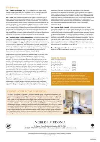 Our current booking conditions apply to all reservations and are available on request.Cover image: Lucca.102FUL25_Kexpanse of green lawn upon which rise three of Italy%u2019s most celebrated monuments: the Cathedral, the Baptistery, and of course the iconic Leaning Tower. Inside the cathedral, a masterpiece of Pisan Romanesque architecture, we can admire the ornate pulpit carved by Giovanni Pisano and the exquisite interplay of light that illuminates the nave. A short stroll brings us to the circular Baptistery, renowned for its remarkable acoustics and the softly patterned stonework that crowns its rotunda. We will have time to view the famous tower and explore the city before meeting for dinner in one of the nearby restaurants. (B, D) Day 5 Vinci & Tuscan Vineyard. This morning we drive into the Tuscan countryside towards Vinci, the town where Leonardo da Vinci was born in 1452. We will visit the Museo Leonardiano, Palazzina Uzielli and the Conti Guidi Castle which houses one of the broadest and most original collections devoted to Leonardo the engineer, the architect and the scientist, and to the history of Renaissance technology in general. We also visit the house where Leonardo was born surrounded by the centuries-old olive trees of Montalbano. After our visit we will make a stop at one of the Tuscan vineyards where we learn about the winemaking techniques and enjoy a tasting of some of the wines with a light lunch before returning to our hotel. The remainder of day will be at leisure before we meet for our farewell dinner. (B, L, D)Day 6 Viareggio to London. After breakfast we check out and transfer to the airport for our scheduled flight to London. (B)GRAND HOTEL ROYAL, VIAREGGIO The Grand Hotel Royal in Viareggio is an elegant seaside retreat that blends timeless charm with modern comfort. Set along Viareggio%u2019s iconic promenade, the hotel offers views of the sparkling Tuscan coast and Tyrrhenian Sea with easy access to sandy beaches, boutique shops and lively caf%u00e9s. Inside the hotel guests are welcomed by classic Italian d%u00e9cor, spacious lounges, and an atmosphere that reflects the town%u2019s rich Belle %u00c9poque heritage. The 114 bedrooms are thoughtfully appointed with either a shower or bath, safe, minibar, satellite TV, hair dryer, complimentary tea/coffee making facilities, a heater/air-conditioning unit and complimentary Wi-Fi. All of the elegant rooms are furnished in a classic style and some rooms feature a private balcony overlooking the sea or the hotel%u2019s lush gardens. Guests can also unwind by the outdoor pool, stroll through the hotel%u2019s tranquil gardens, or enjoy refined dining with menus inspired by fresh Tuscan ingredients and coastal specialties. Guests can savour exquisite meals in the hotel%u2019s elegant restaurant or enjoy a relaxing aperitivo with sunset views. 2 Chester Close, Belgravia, London, SW1X 7BE+44 (0)20 7752 0000 | info@noble-caledonia.co.uk | www.noble-caledonia.co.ukPRICE INCLUDES: Economy class scheduled air travel %u2022 Five nights accommodation at the Grand Hotel Royal %u2022 Meals as indicated (B - Breakfast, L - Lunch, D - Dinner) %u2022 Wine, beer or soft drinks with each included lunch and dinner %u2022 Excursions as specified with local guide %u2022 1st Class tickets for Madame Butterfly at the Puccini Opera Festival %u2022 Noble Caledonia Tour Manager %u2022 Gratuities %u2022 Transfers %u2022 Airport taxes. Not Included: Travel insurance.PRICES PER PERSONBased on double occupancyDay 1 London to Viareggio, Italy. Fly by scheduled flight and on arrival, transfer to the Grand Hotel Royal in Viareggio for our five night stay. After some time to settle in we will meet this evening for dinner. (D)Day 2 Lucca. After breakfast we make our way inland to the lovely town of Lucca. Hidden behind imposing Renaissance walls the city boasts delightful, cobbled streets, handsome piazzas and shady promenades. Our guided tour will include the Basilica di San Frediano, the Roman amphitheatre and the San Martino Cathedral, the most important religious monument in Lucca. We will also visit the Puccini Museum located in the house where the composer was born in 1858 and which has been faithfully reconstructed containing furniture and paintings which belonged to the family. Also see many documents and the Steinway piano on which Puccini composed some of his masterpieces. After some time for lunch and further exploration of Lucca we will return to the hotel in the late afternoon with the remainder of the day at leisure. (B) Day 3 Torre de Lago & Puccini Opera Festival. This morning is free to relax in the hotel, visit the beach or explore Viareggio. Later this afternoon we will drive the short distance to Torre del Lago. Puccini originally visited the town in the summer of 1891 and in 1899 bought a house here where he wrote many of his works including La Boheme, Tosca and Madame Butterfly. Today we can explore the house which was his main residence until his death in 1924. Now a museum, it contains many of his manuscripts, paintings and furnishings as well as his Forster piano. After dinner in a local restaurant we will head to the Teatro Puccini for a performance of Madame Butterfly. (B, D)Madame Butterfly is a tragic opera set in Nagasaki, Japan, in the early 1900s. It tells the story of Cio-Cio-San, a young Japanese geisha (nicknamed %u201cButterfly%u201d), who enters into an arranged marriage with Lieutenant B.F. Pinkerton, an American naval officer. Pinkerton treats the marriage casually, viewing it as temporary while he is stationed abroad whilst Cio-Cio-San gives up her family, converts to Christianity, and devotes herself to him. Shortly after the wedding, Pinkerton leaves Japan. Cio-Cio-San waits faithfully convinced he will return and gives birth to his son. When Pinkerton returns, with his American wife, they want to take the child back to America. Pinkerton, overwhelmed by guilt, cannot face Cio-Cio-San. When she learns the