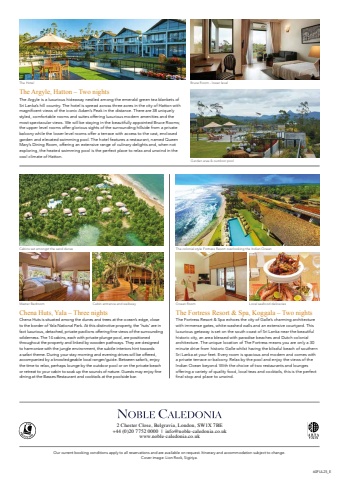 2 Chester Close, Belgravia, London, SW1X 7BE+44 (0)20 7752 0000 | info@noble-caledonia.co.ukwww.noble-caledonia.co.uk60FUL25_EOur current booking conditions apply to all reservations and are available on request. Itinerary and accommodation subject to change.Cover image: Lion Rock, Sigiriya.The Argyle, Hatton %u2013 Two nightsThe Argyle is a luxurious hideaway nestled among the emerald green tea blankets of Sri Lanka%u2019s hill country. The hotel is spread across three acres in the city of Hatton with magnificent views of the iconic Adam%u2019s Peak in the distance. There are 38 uniquely styled, comfortable rooms and suites offering luxurious modern amenities and the most spectacular views. We will be staying in the beautifully appointed Bruce Rooms; the upper level rooms offer glorious sights of the surrounding hillside from a private balcony while the lower level rooms offer a terrace with access to the vast, enclosed garden and elevated swimming pool. The hotel features a restaurant, named Queen Mary%u2019s Dining Room, offering an extensive range of culinary delights and, when not exploring, the heated swimming pool is the perfect place to relax and unwind in the cool climate of Hatton. Garden area & outdoor poolThe Hotel Bruce Room - lower levelThe Fortress Resort & Spa, Koggala %u2013 Two nightsThe Fortress Resort & Spa echoes the city of Galle%u2019s charming architecture with immense gates, white-washed walls and an extensive courtyard. This luxurious getaway is set on the south coast of Sri Lanka near the beautiful historic city, an area blessed with paradise beaches and Dutch colonial architecture. The unique location of The Fortress means you are only a 30 minute drive from historic Galle whilst having the blissful beach of southern Sri Lanka at your feet. Every room is spacious and modern and comes with a private terrace or balcony. Relax by the pool and enjoy the views of the Indian Ocean beyond. With the choice of two restaurants and lounges offering a variety of quality food, local teas and cocktails, this is the perfect final stop and place to unwind.Chena Huts, Yala %u2013 Three nightsChena Huts is situated among the dunes and trees at the ocean%u2019s edge, close to the border of Yala National Park. At this distinctive property, the %u2018huts%u2019 are in fact luxurious, detached, private pavilions offering fine views of the surrounding wilderness. The 14 cabins, each with private plunge pool, are positioned throughout the property and linked by wooden pathways. They are designed to harmonize with the jungle environment, the subtle interiors hint towards a safari theme. During your stay morning and evening drives will be offered, accompanied by a knowledgeable local ranger/guide. Between safari%u2019s, enjoy the time to relax, perhaps lounge by the outdoor pool or on the private beach or retreat to your cabin to soak up the sounds of nature. Guests may enjoy fine dining at the Basses Restaurant and cocktails at the poolside bar.Master Bedroom Cabin entrance and walkwayCabins set amongst the sand dunesOcean Room Local seafood delicaciesThe colonial style Fortress Resort overlooking the Indian Ocean