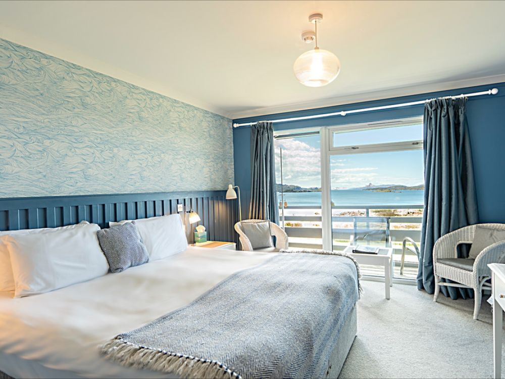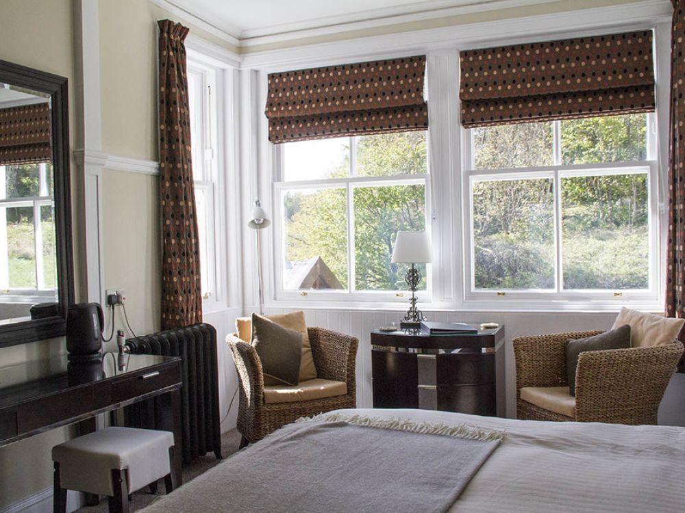 Designed to make the most of the high ceilings and generous proportions of the original building and featuring dual aspect windows, the largest of the garden view rooms offers a separate seating area, king sized bed and beautiful vistas of the gardens and the Argyll countryside beyond.