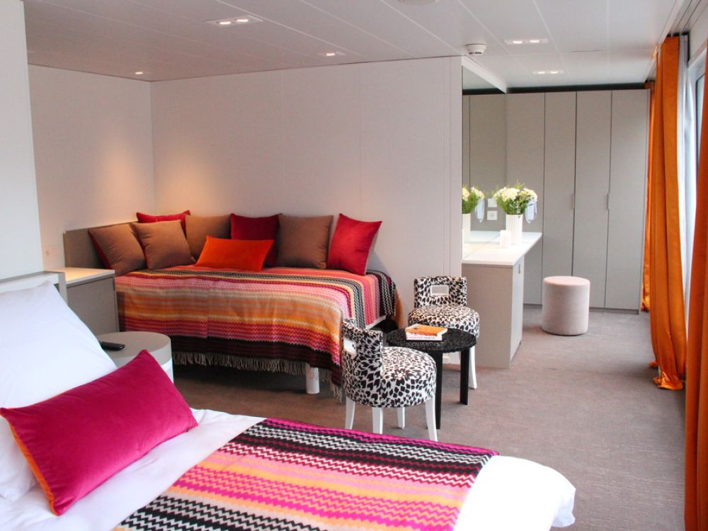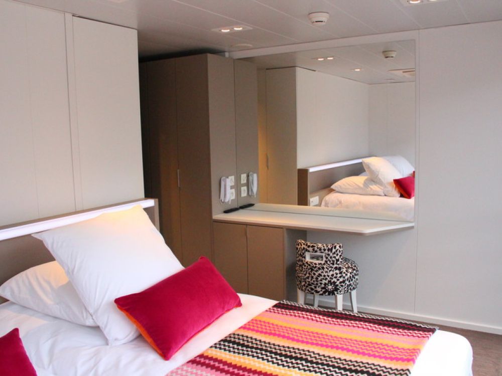 All cabins feature individually controlled air-conditioning, en-suite bathroom with shower, satellite television, hairdryer, closet and a safe. Category 2 and 3 cabins measure 14 square metres and the Junior Suite measures 23 square metres. All cabins have twin beds (which can be configured to a double bed – with separate mattresses and bed linen) with the exception of cabins 125 and 221 which have a fixed double bed. Cabins on the Main Deck feature large picture windows which can be opened and those on the Upper Deck feature French Balcony style (floor to ceiling) sliding windows, allowing you to admire the passing scenery from your cabin