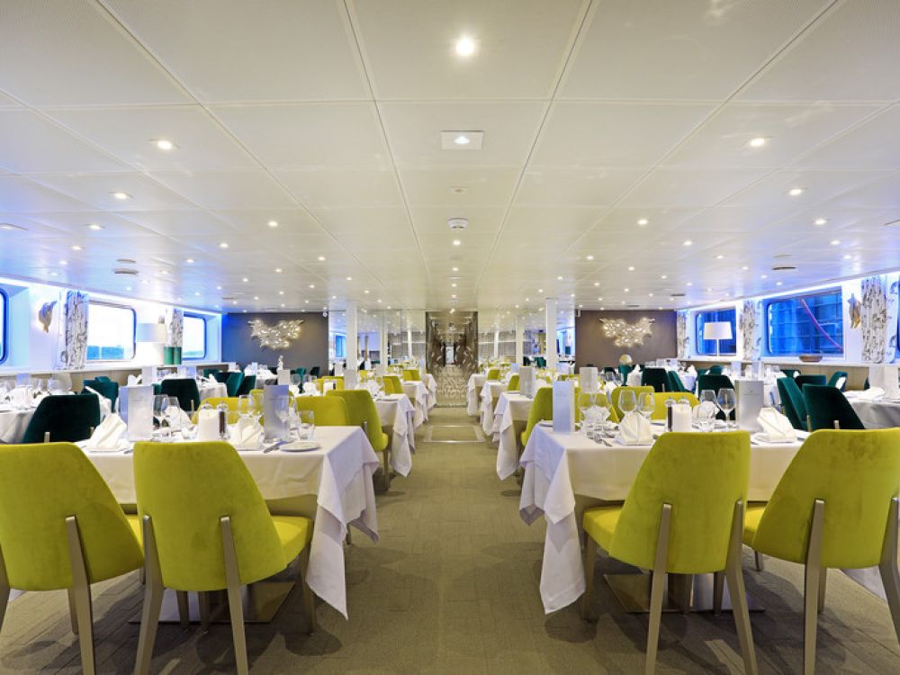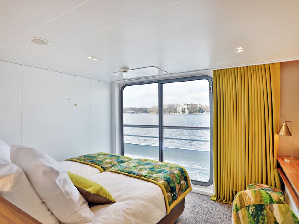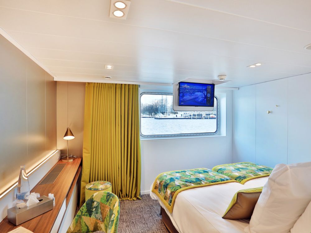 The cabins are spread across the Main and Upper Decks and all are outside facing. All cabins are located above water level affording outside views and there is plenty of natural light both within the cabins and in the public areas. Cabins on the Upper Deck feature French balcony with sliding floor to ceiling windows and those on the Main Deck have large windows. All cabins are fitted with a bathroom with shower, wash basin and WC. Cabins also feature a safe, ample storage space, flat screen television, small desk and seating area, hairdryer, plus all have their own climate control units. All cabins have two separate mattresses laid together forming a double bed, although these can be separated on request. Cabins measure 14.5 m2 except for the three single cabins and cabin 202 which measure 12 m2.