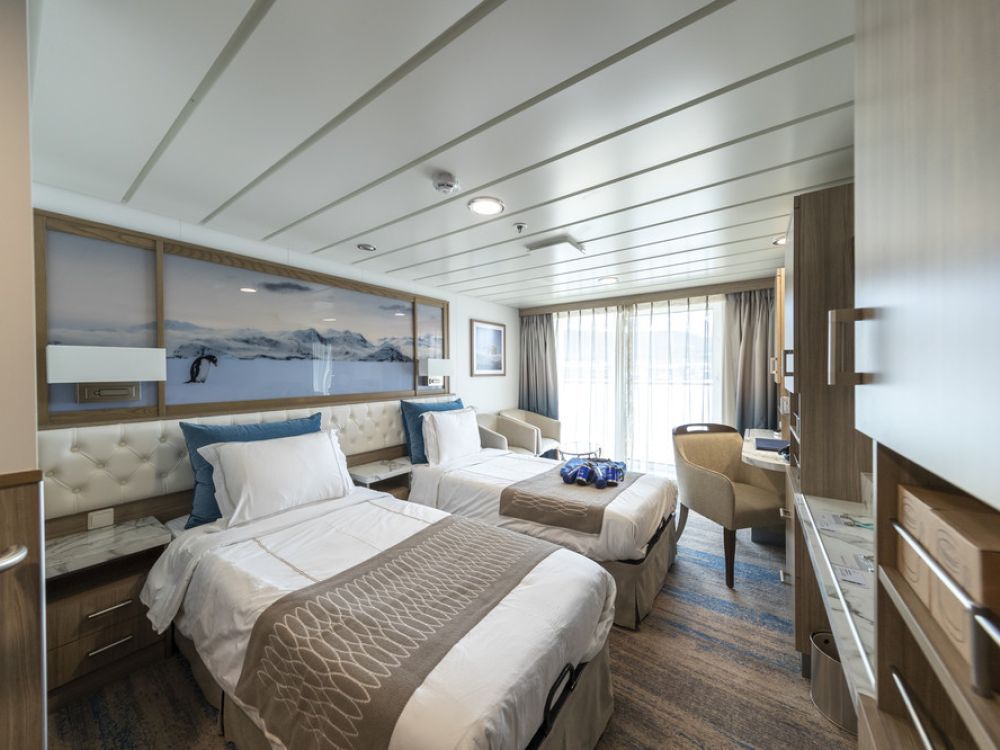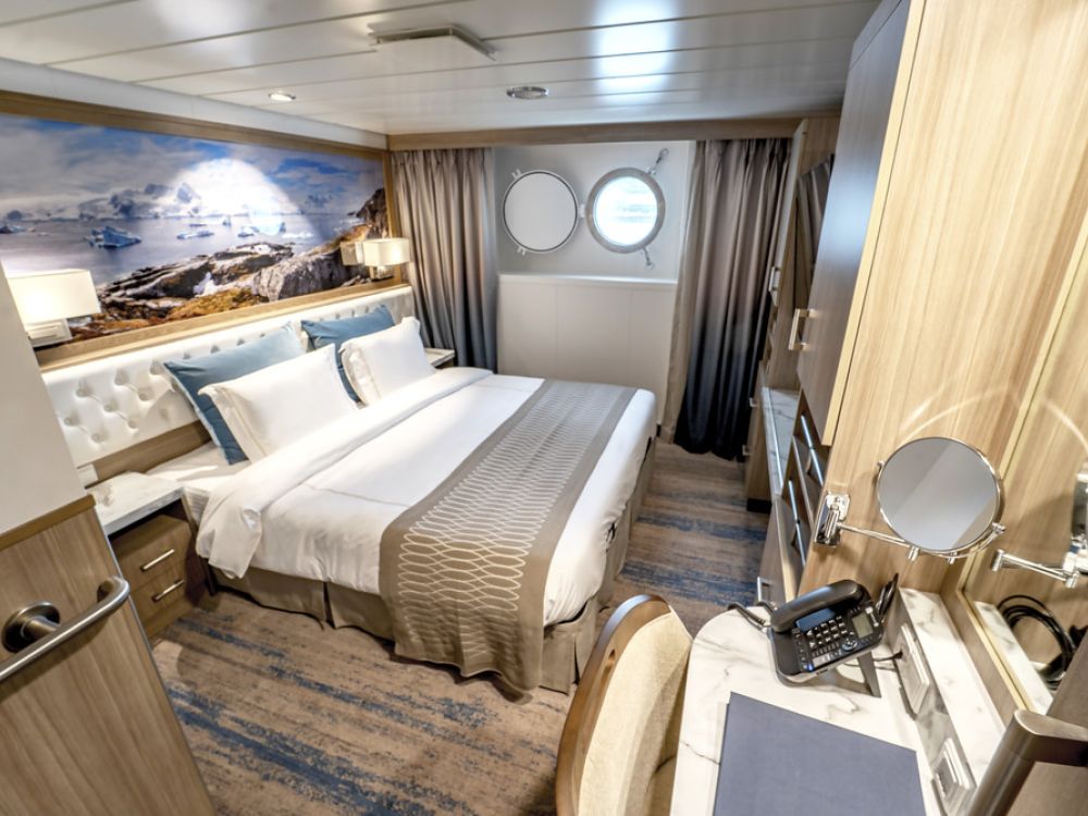Cabins on board are spacious and well designed with a simple, neutral colour palette taking inspiration from nature in the polar regions. The Aurora Twin Staterooms measure between 16 and 23 square metres and the Balcony Staterooms measure between 25 and 28 square metres (inclusive of balcony). The Superior Balcony Staterooms and Junior Suite measure approximately 40 square metres whilst the Captain’s Suite provides 45 square metres of space. All cabins feature private en-suite bathrooms, ample storage, safe, televisions, desk, mini-bar and individually controlled temperature thermostat. The comfortable beds in each cabin can be configured as a king size bed or twin beds. You will find a selection of toiletries (shampoo, body wash and body lotion) in the bathroom and bathrobes and powerful hairdryers are also provided in your cabin. Slippers and refillable water bottles are also available and can be requested from reception.