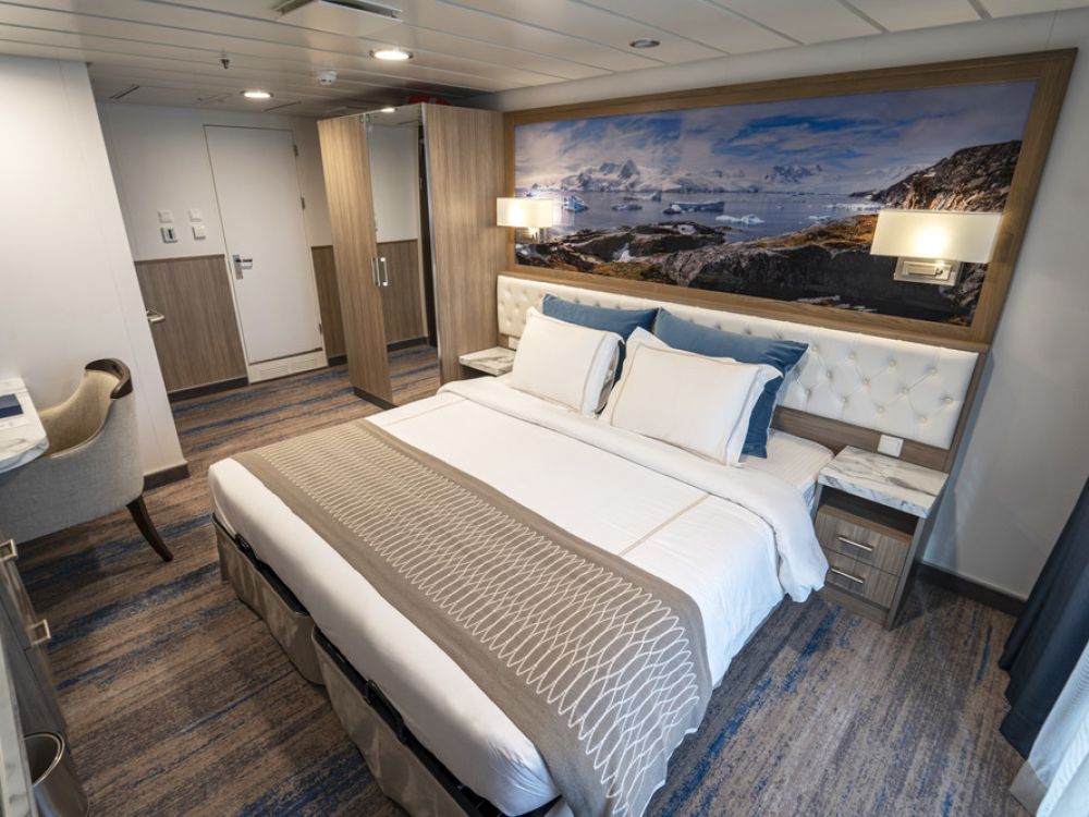 Cabins on board are spacious and well designed with a simple, neutral colour palette taking inspiration from nature in the polar regions. The Aurora Twin Staterooms measure between 16 and 23 square metres and the Balcony Staterooms measure between 25 and 28 square metres (inclusive of balcony). The Superior Balcony Staterooms and Junior Suite measure approximately 40 square metres whilst the Captain’s Suite provides 45 square metres of space. All cabins feature private en-suite bathrooms with heated floors, ample storage, safe, televisions, desk, mini-bar and individually controlled temperature thermostat. You will find a selection of toiletries (shampoo, body wash and body lotion) in the bathroom. You will also find bathrobes and a powerful hairdryer in your cabin. Slippers and refillable water bottles are also available and can be requested from reception. The comfortable beds in each cabin can be configured as a king size bed or twin beds.