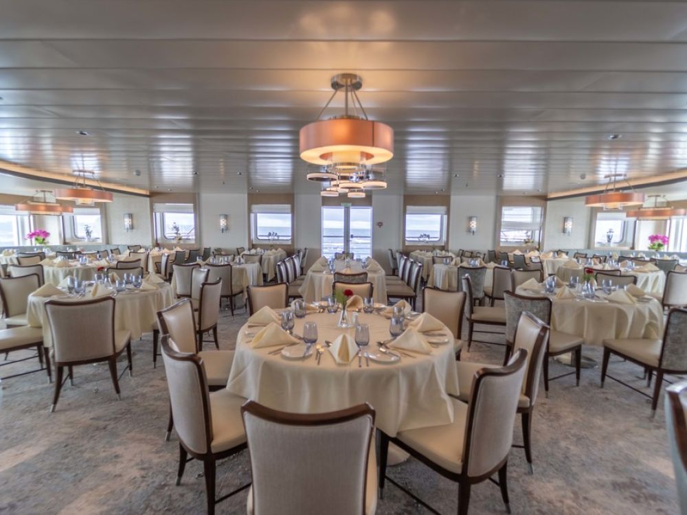 Breakfast, lunch and dinner are served in the dining room on Deck 5. Tables are unassigned for an informal atmosphere and easy mingling. A barbeque will be held on one evening during your cruise on Deck 8 (subject to weather and sea conditions). House wine, beer and soft drinks are included with dinner. Complimentary tea and coffee are available self-service 24 hours a day in the Lecture Theatre.
