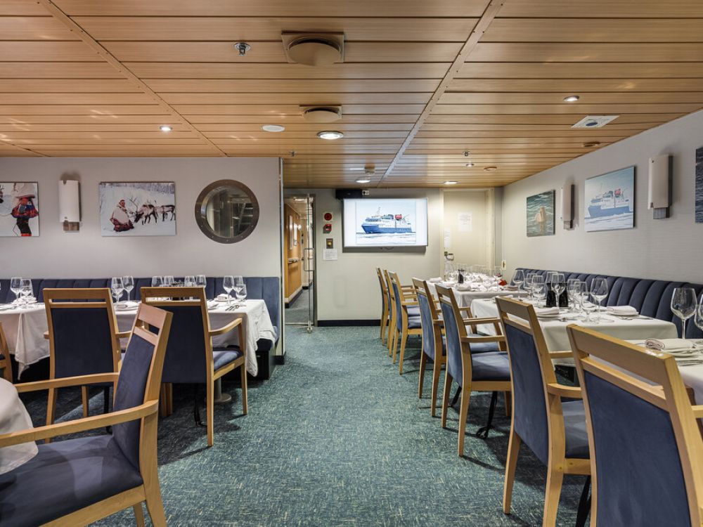 The attractive dining room seats all passengers in a single sitting and offers delicious meals with a mixture of table service and buffet. It is comfortable and spacious enough to accommodate all passengers and expedition staff in one seating. The informal dining arrangement adds to the friendly atmosphere on board and meals are a great chance to discuss all you have seen with your fellow travellers, and for the expedition team to share their knowledge.