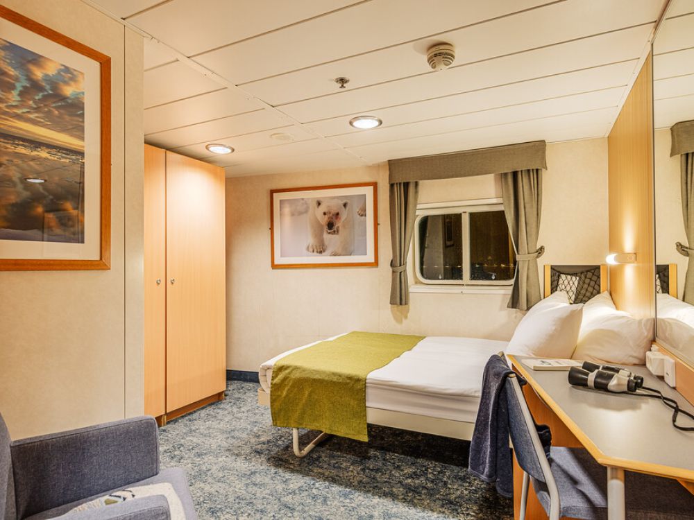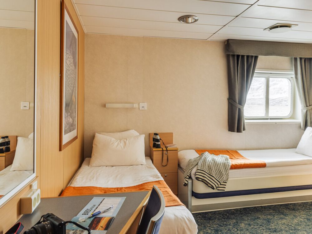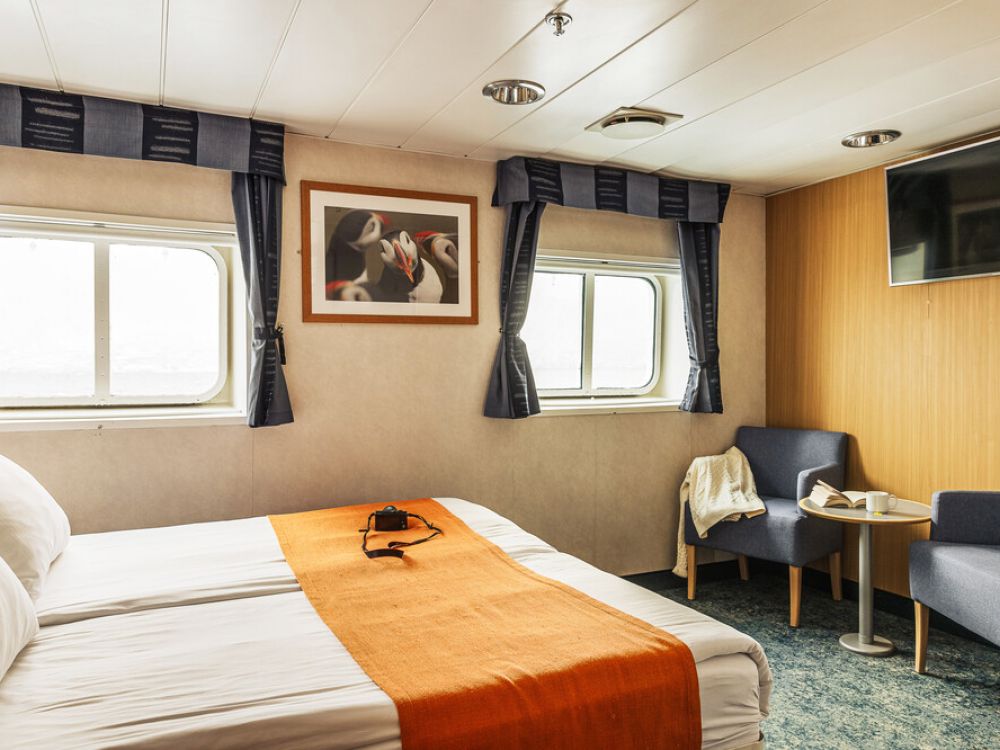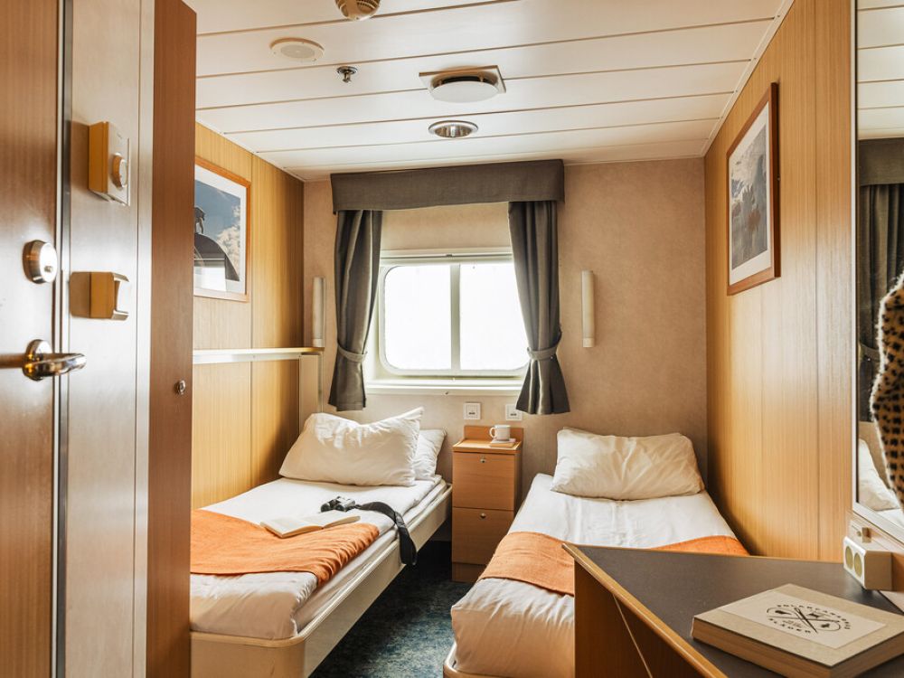 Passenger cabins are located on two decks and cabins are priced according to size and location. All have outside views, individually controlled heating and air-conditioning, private shower and toilet. They are well designed with typical Scandinavian light woods and pleasing colours. The superior grade cabins on decks three and four are spacious and have a seating area. The owner’s cabin on deck four is also spacious, has two large picture windows and is in the prime location on the vessel.