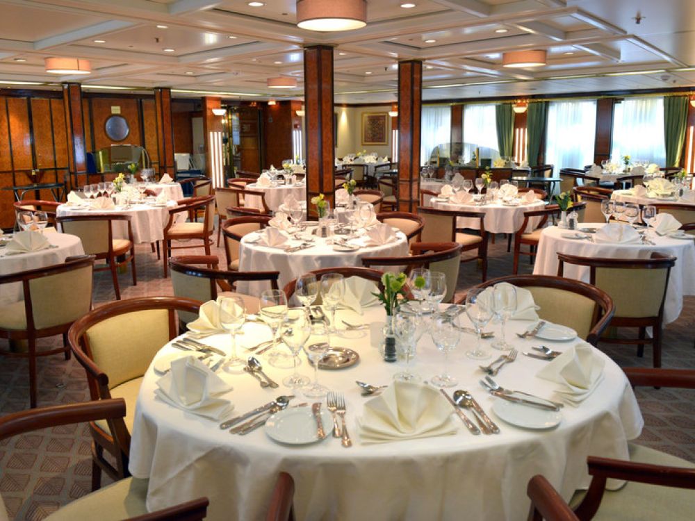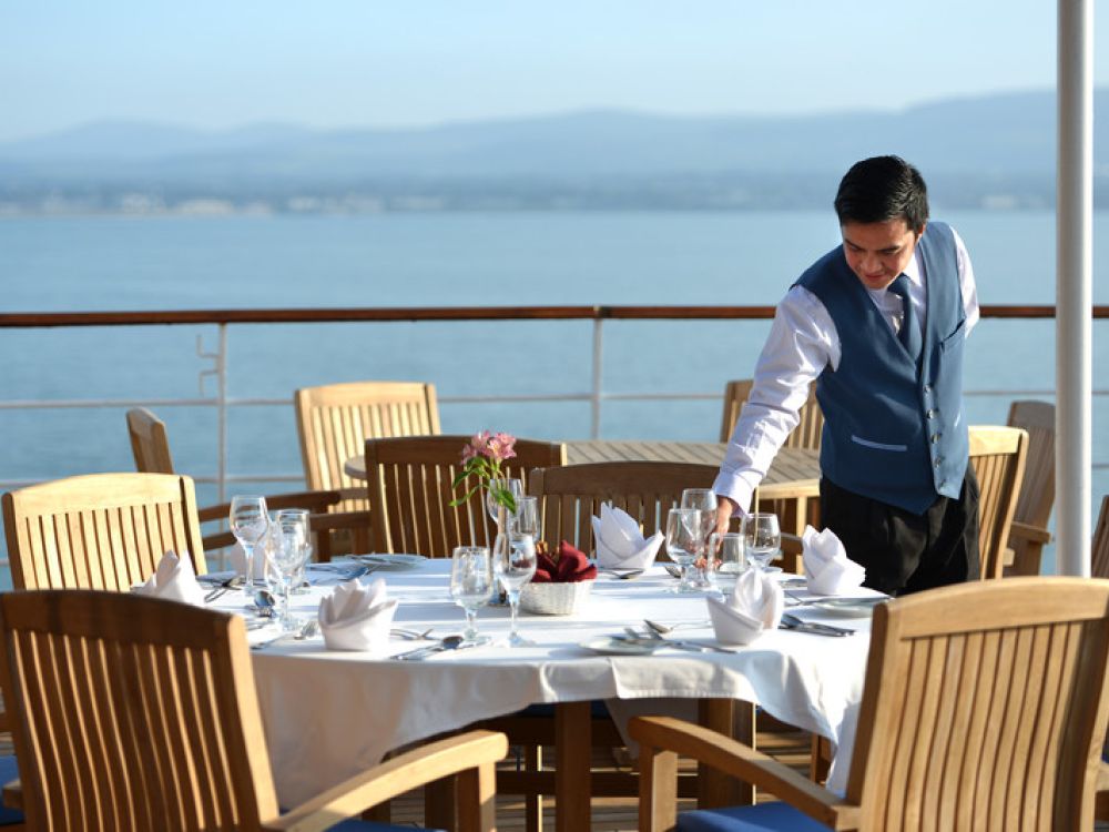 In keeping with the informal atmosphere on board, when dining you are able to choose your seating arrangements at your leisure. Whether that be joining a table of four to six other passengers outside on the Lido Deck in the evening’s sunshine or whether you prefer to enjoy meals in the à la carte restaurant. For those travelling alone, our onboard friendly restaurant staff will take care to ensure you are seated with other like-minded travellers. In the main elegant dining room, breakfast is served buffet-style, with certain items cooked to order on request. Lunch and dinner are à la carte with an excellent choice of dishes, with the menu reflecting the daily catch or local delicacies. To enhance your dining experience even further a selection of wines are included with both meals and there is also a comprehensive wine list with a wide selection of new and old world wines from which to choose.