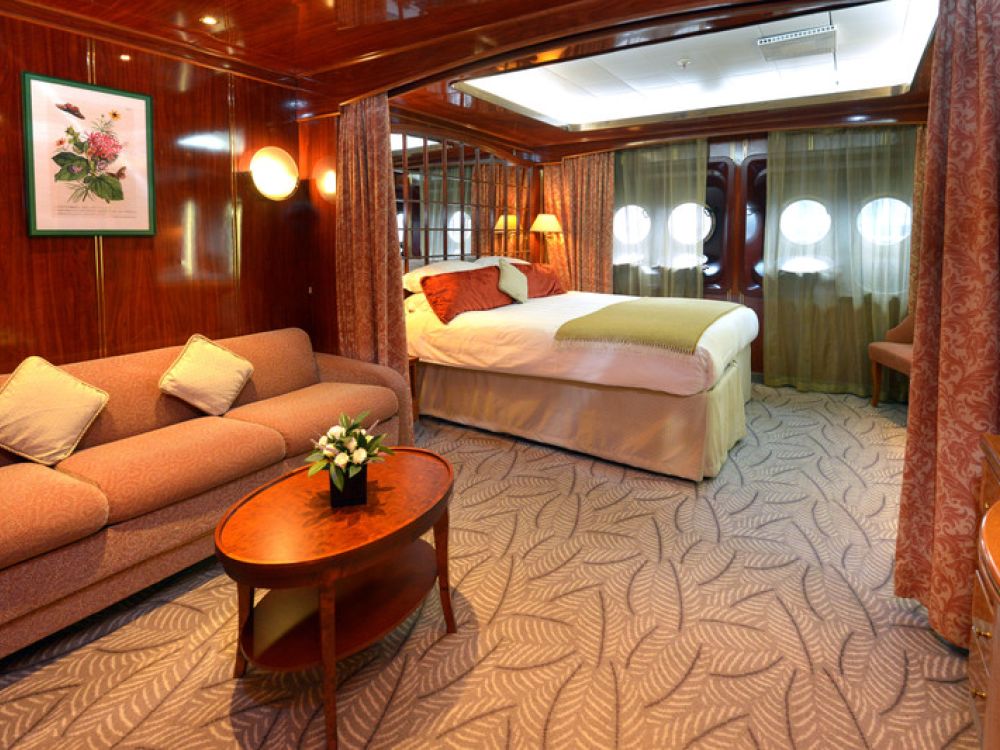 On board there are 59 exceptionally spacious and well-designed suites. All feature a seating area and some have private balconies, whilst those on the Marco Polo Deck feature tinted, sliding glass doors allowing greatly enhanced viewing opportunities from your suite and quick access to the deck when a pod of whales or dolphins is spotted. The feeling of luxury is enhanced by the wood panelling and brass, which predominates throughout the vessel conveying the atmosphere of a private yacht. The passenger accommodation is arranged over five decks and all suites have outside views. Each affords considerable comfort with en-suite bathroom featuring marble-topped vanity unit with sink and walk-in shower, a large wardrobe, dressing table with large mirror and stool and excellent storage. There is a mini-fridge, flat screen television and a telephone in each suite. Refillable water bottles, dressing gowns and slippers are also provided for your comfort. Other facilities include a programmable electronic safe, hairdryer, assorted Noble Isle toiletries, air-conditioning and heating. The suites on each deck have their own colour theme. Soft hues and blended tones enhance the traditional maritime style making the passenger accommodation an inviting and relaxing place to be. The comfortable beds in each suite can be configured as either double or twin.